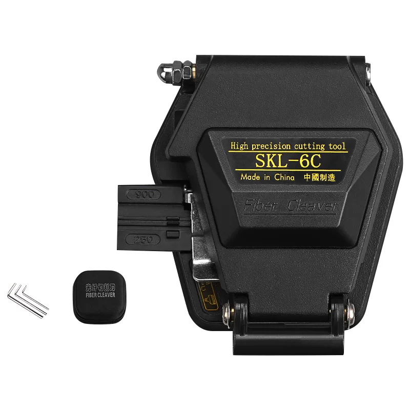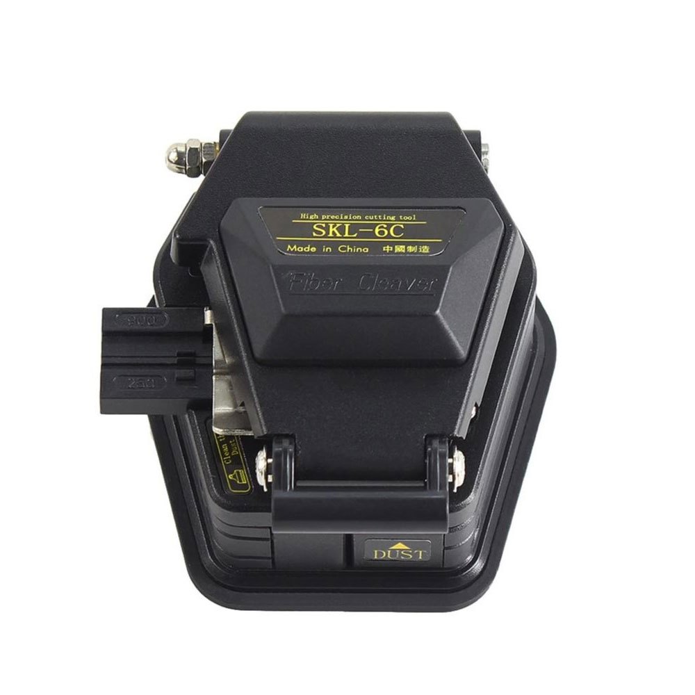 The SKL-6C fiber optic cleaver utilizes high-strength 16-bit blade planes. It is durable and comes with a triple accessory that can flex to cut fiber and bare fiber, featuring an automatic rear knife slide. It is easy to use—simply place a good fiber cover on the lid, press, and you can complete the entire cutting job.